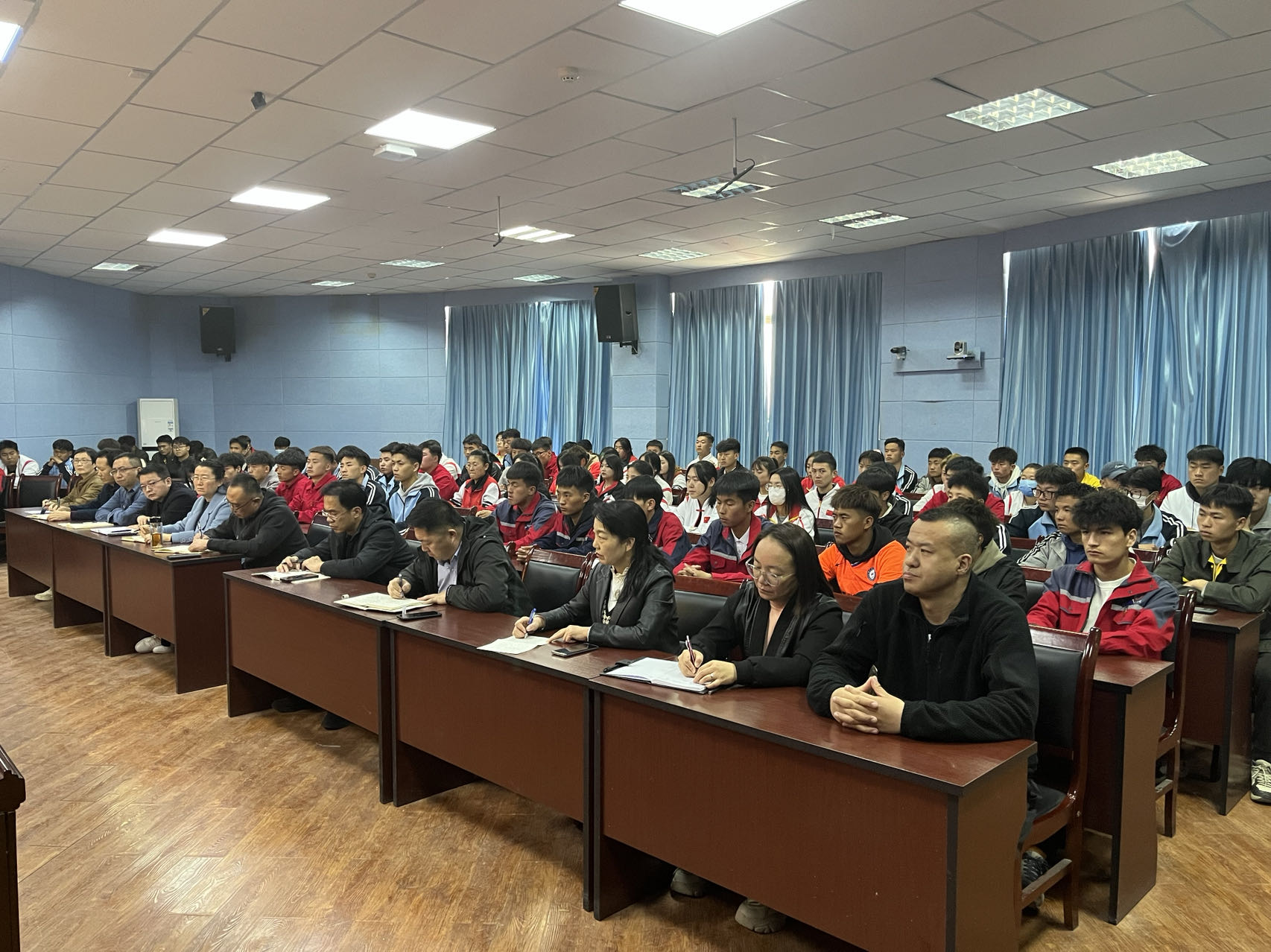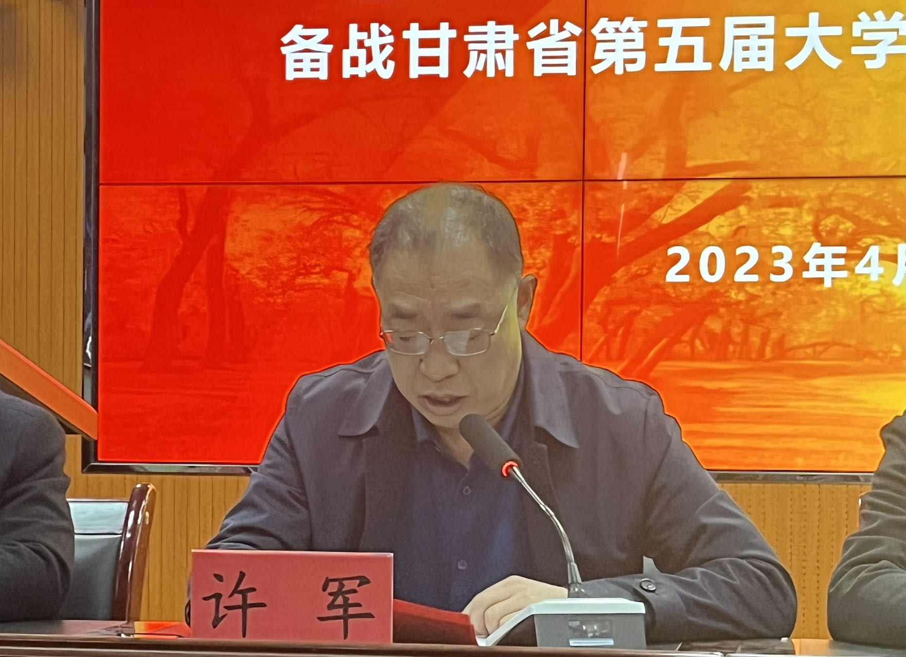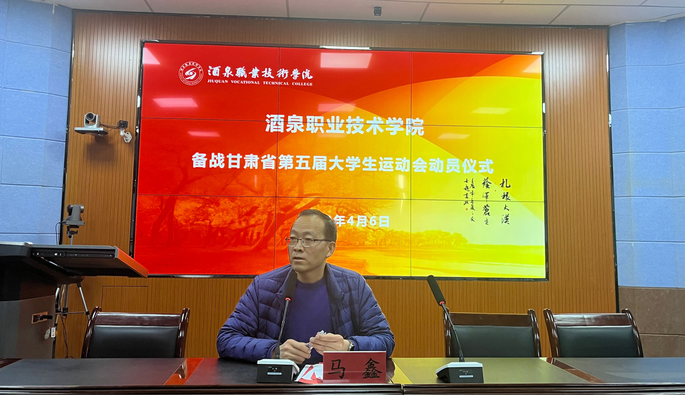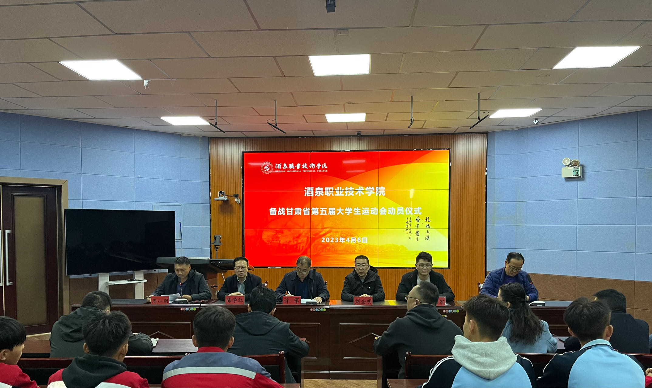 4月6日,酒泉职业技术学院备战甘肃省第五届大学生运动会动员仪式在经世楼二楼录播室隆重举行。学校党委副书记许军出席会议并发表动员讲话,学生处处长刘全明、教务处副处长陈学红、校团委书记苟浩军、体育与健康学院院长周小刚及各二级学院负责人、各代表队教练员、全体运动员共90多人参加了动员大会。会议由体育与健康学院党支部副书记马鑫主持。