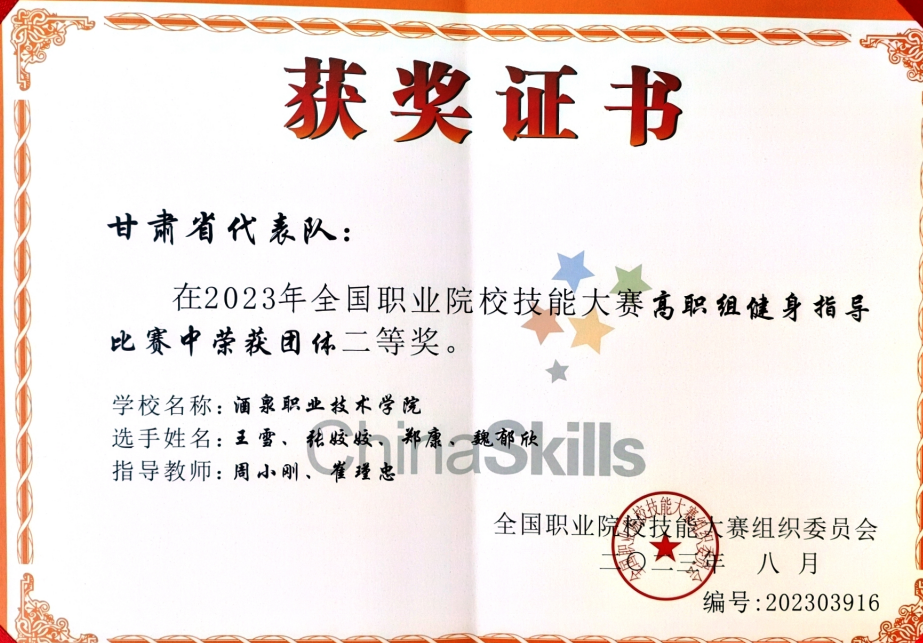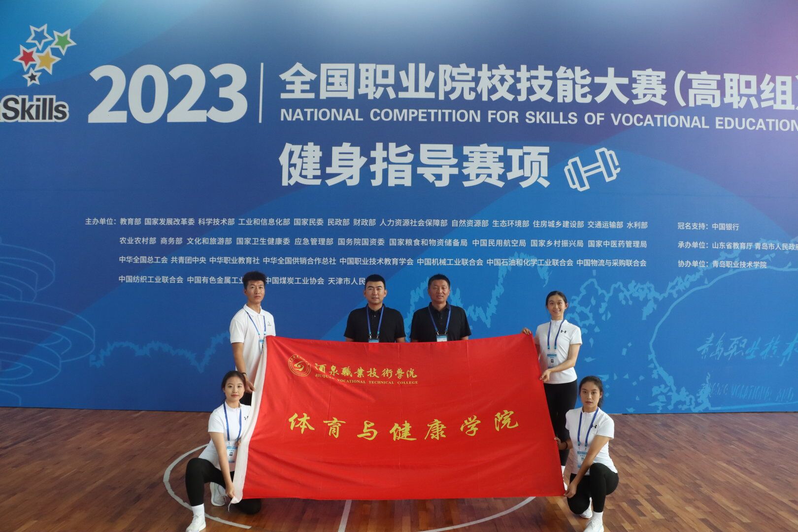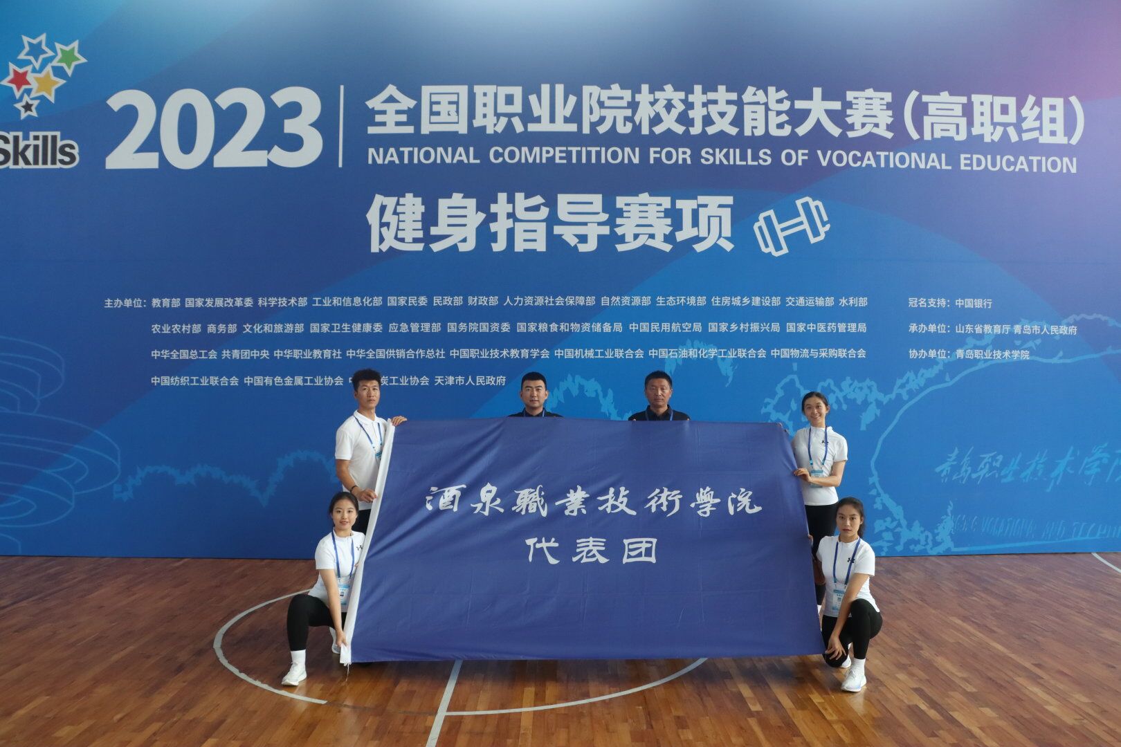 8月13日至16日,2023年全国职业院校技能大赛(高职组)健身指导赛项在青岛职业技术学院举行。我校体育与健康学院代表队代表甘肃省高职院校参赛。经过激烈角逐,由体育与健康学院周小刚、崔瑾忠两位老师指导,王雪、郑康、张姣姣、魏郁欣四位同学组成的代表队斩获团体二等奖的骄人成绩。