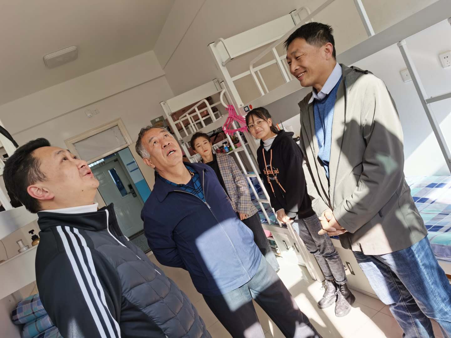 为认真贯彻落实学校主题教育活动,深入开展调查研究,增强我院学生在学生公寓内的安全防范意识,进一步了解学生在生活和学习上的相关情况,体育与健康学院各领导于2020年10月15日下午开展了学生宿舍走访调研活动,院长周小刚,副书记徐云鹏,副院长姜振捷,副院长王瑞,班主任常鑫参与了此次祁连男生公寓至理轩、飞天女生公寓友声阁走访慰问。