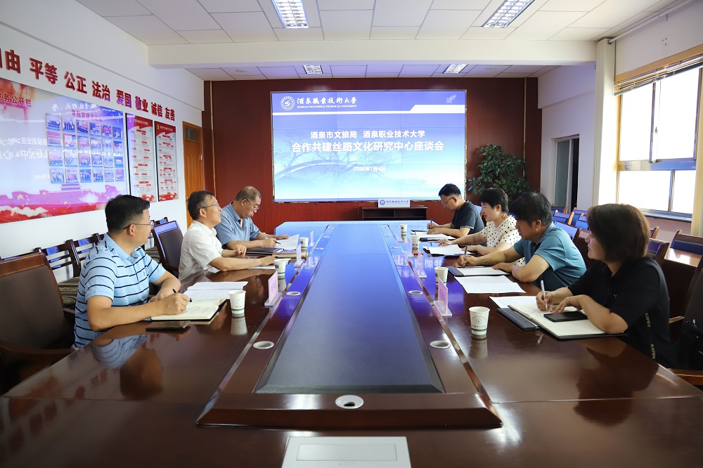 7月4日下午,酒泉市文体广电和旅游局党组书记、局长马慧君一行在酒泉职业技术大学行知楼4楼会议室,就深化政校合作、共建丝路文化研究中心(图书馆)开展专题研讨。酒泉职业技术大学党委书记易志军,党委副书记、校长许军出席会议,旅游与烹饪学院党支部副书记、院长刘兴龙参加研讨。