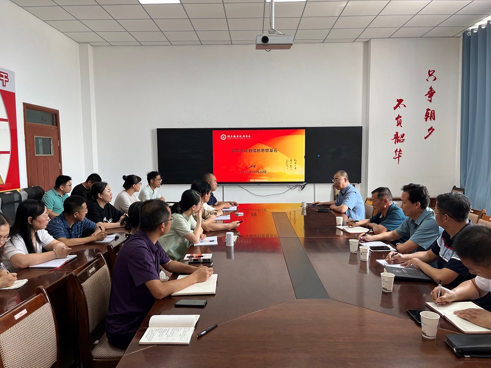 为深入学习贯彻习近平新时代中国特色社会主义思想,加强党员教师的思想政治教育,2025年6月20日,党委副书记、校长许军以“筑牢文化自信的思想基石”为题,为旅游与烹饪学院以及电子与信息工程学院党员教师讲授了一场内容丰富、意义深远的专题党课。