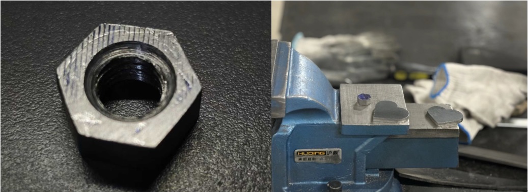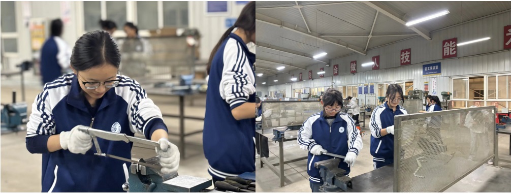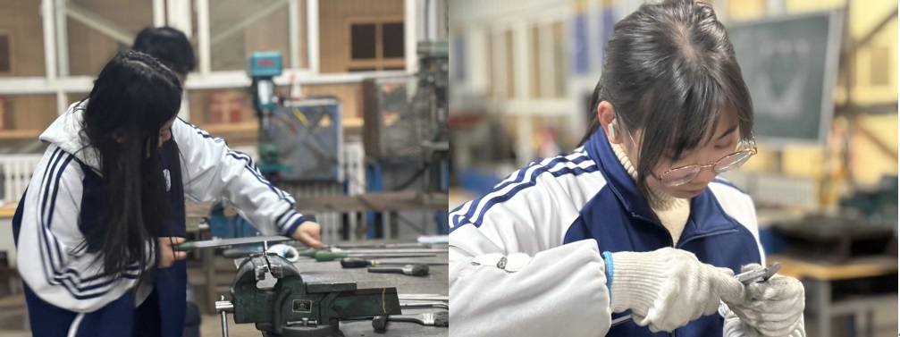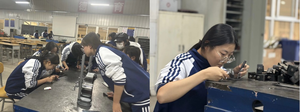 在实训过程中,同学们不仅提升了个人动手能力与解决问题能力,也强化了团队协作意识。高佳妮同学感慨道:“因为有同学的帮助,我才能完成这一个作品。”从互相学习操作技巧,到共同克服困难、分享成功的喜悦,同学们在协作中深化了友谊,也体会到集体智慧的力量。此外,同学们对“工匠精神”有了更真切的体悟。杨庆同学写道:“重复的锉削、打磨虽枯燥,却磨练了我的耐心与毅力”。谢旻同学说:“每一滴汗水都包含着工人对工作的认真负责与坚守”。在亲手打造作品的过程中,学生们不仅理解了何为精益求精,更学会了在反复实践中保持专注与坚持。”杨新月同学说:“当手中的铁块最终被磨成一颗略显笨拙的爱心和一枚规整的六角螺母时,我触摸到的不仅是金属的质感,更是一种深刻的隐喻。这次实训让我懂得,真正的服务匠心,是感性与理性的完美结合,是在冷硬的“标准”框架内,打磨出最温暖‘惊喜’。