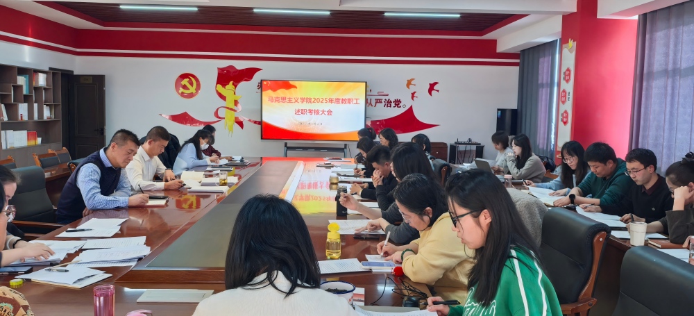 院系动态 > 正文为全面总结2025年度各项工作成效,客观评价教职工履职表现,进一步凝聚发展共识、明确奋进方向,1月6日,马克思主义学院2025年度教职工述职考核大会在学院会议室顺利召开。会议严格按照既定议程,依次开展教职工述职汇报与民主评议背对背测评打分环节,全面检验学院年度工作成果与教职工综合素养。